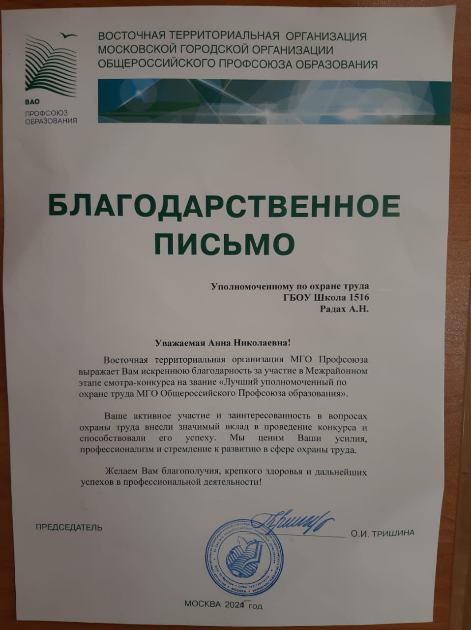 Хочется отметить работу нашей коллеги Радах А.Н., которая получила благодарственное письмо за участие в конкурсе в рамках Городского конкурса Уполномоченных по охране труда. Хотя мы не стали призёрами, для нас это был ценный опыт и урок. Продолжаем двигаться вперёд и нацелены на новые достижения.