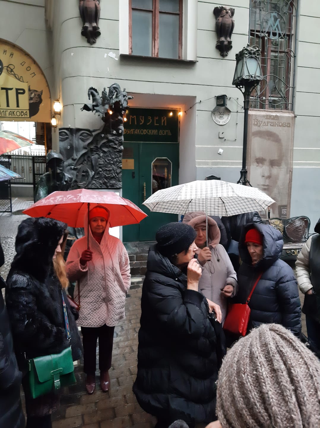 Погода нам не помешала, и мы окунулись в увлекательный рассказ Ларисы Оганесовны, который открывал нам страницы эпохи Булгакова. Памятники, улочки, но нас ждал Музей Булгакова.